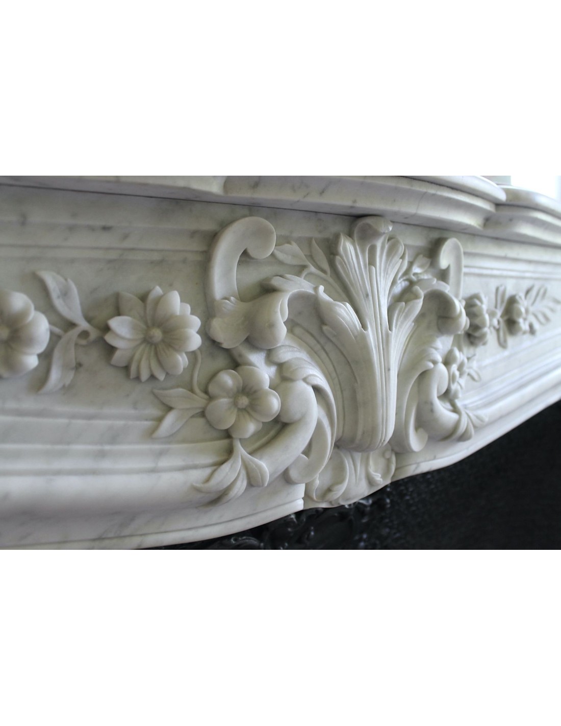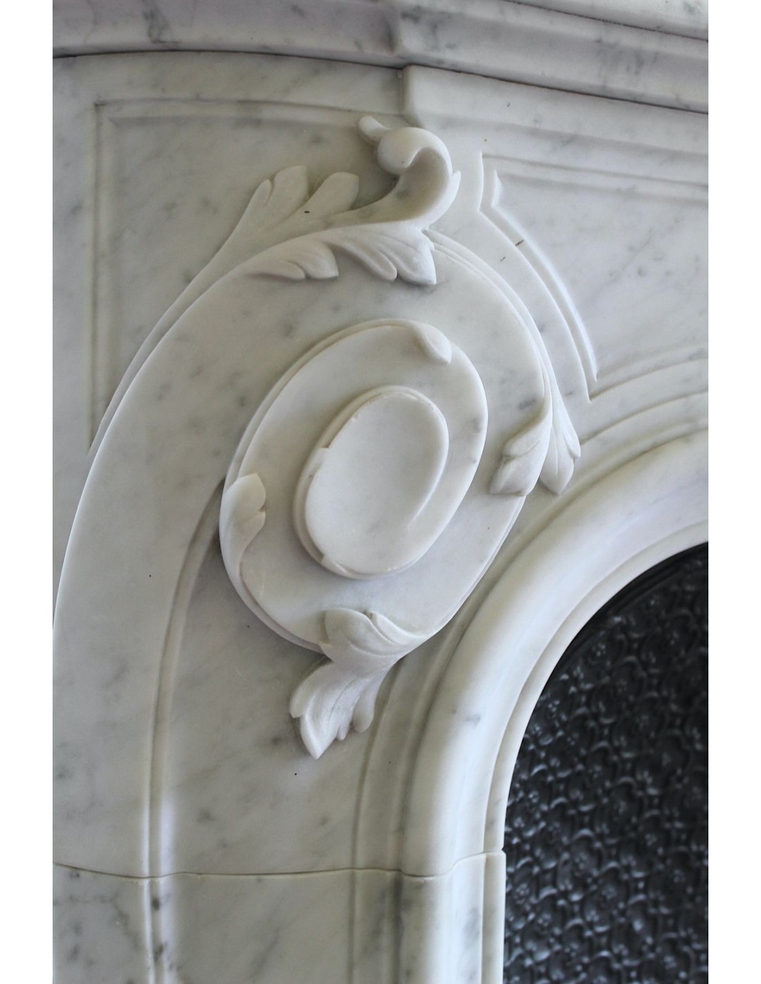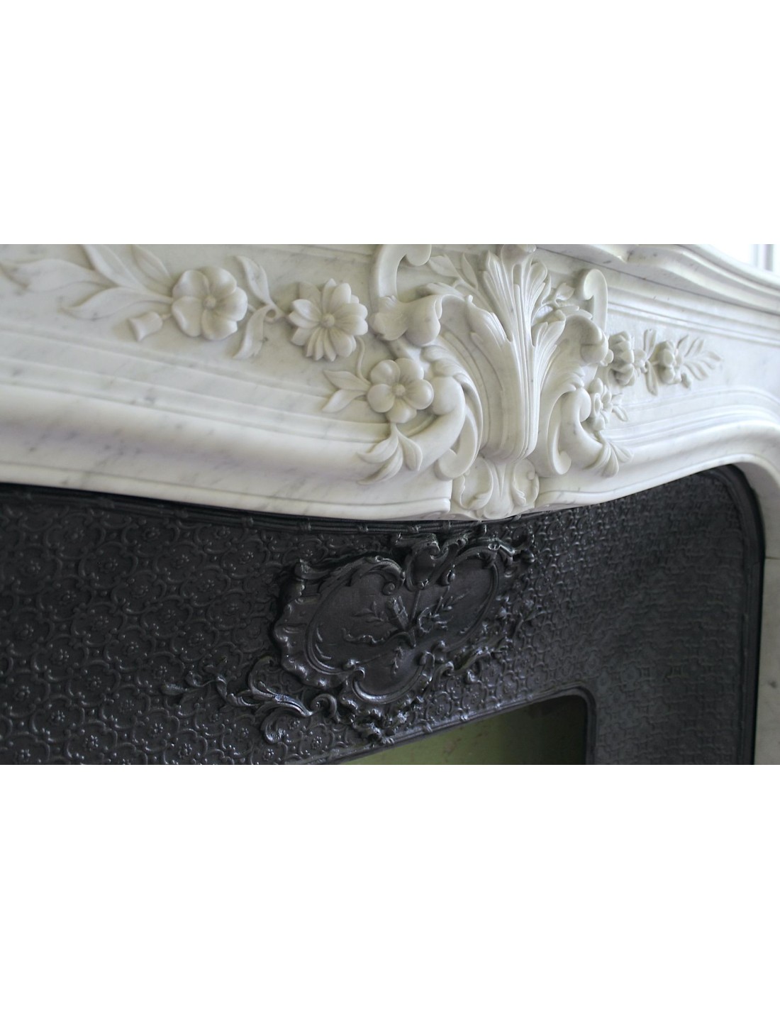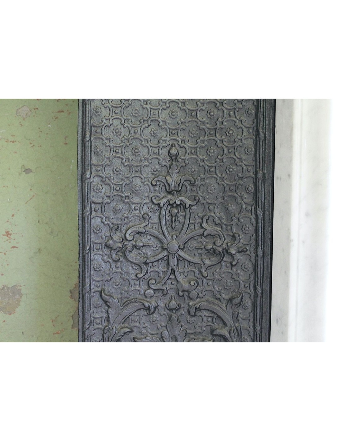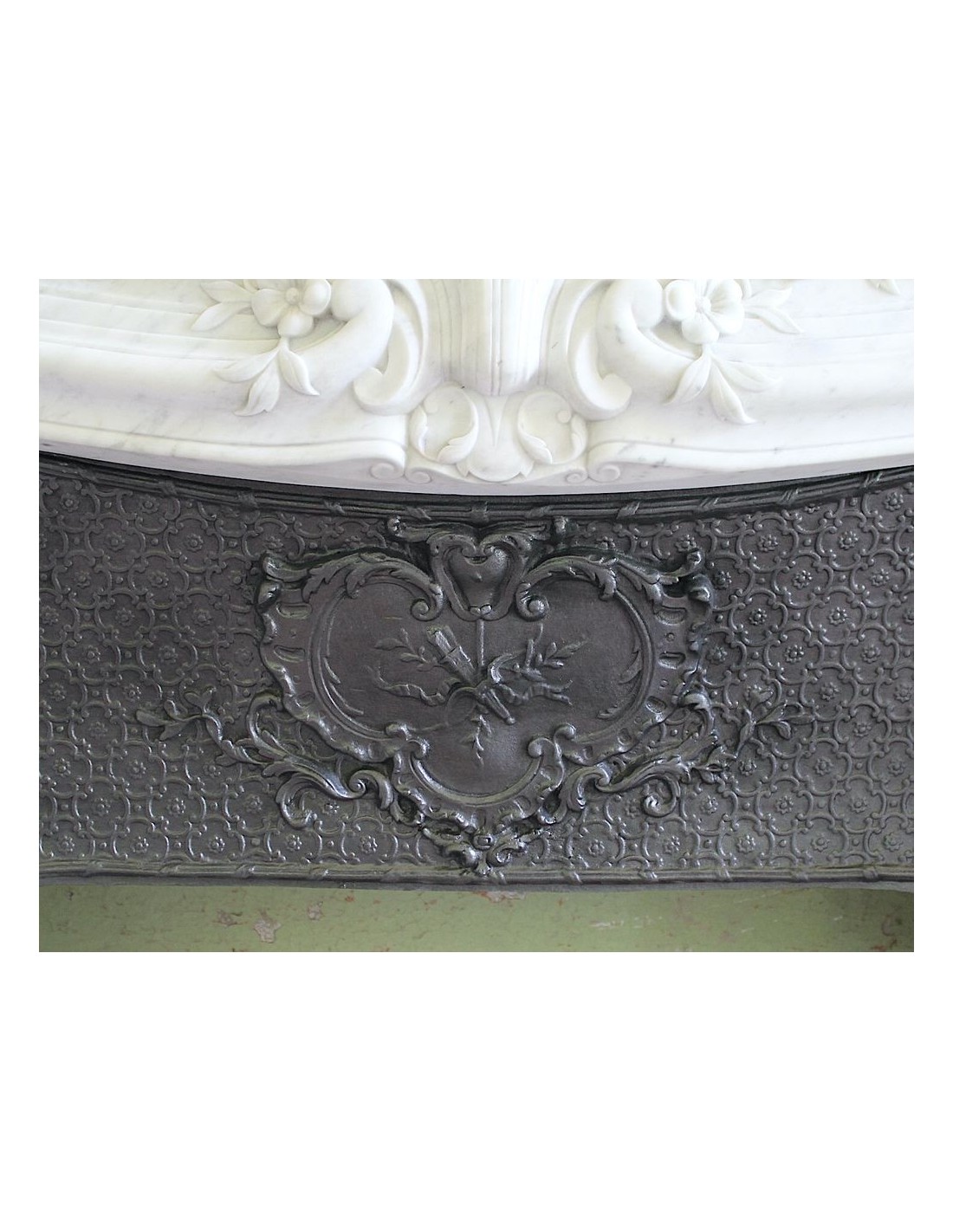 In più, questo camino reca in dote anche un altrettanto snello controcuore in ghisa artistica con fondo a tapisserie e frontone con decorazioni tutte dedicate all'amore tra un uomo ed una donna, all'amore non solo platonico bensì all'amore in tutte le sue manifestazioni (era un poco birichino, il Louis, per cui approfondirò l'esame di queste decorazioni non qui e pubblicamente, ma se e quando verrete a trovarmi).