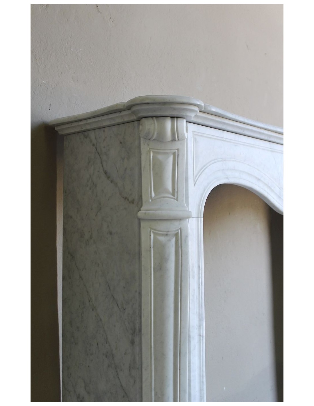 Ha una sola conchiglia (di qui il suo nome, "COQUILLE" al singolare mentre in molti camini della stessa famiglia le conchiglie sono tre, due piccole ai lati del frontale ed una più grande al centro dello stesso frontale)) e, guardatela bene, questa specifica figura scultorea é del tutto particolare, ha un disegno che si distacca dalla classica rappresentazione della conchiglia, un disegno, come dire, "TUTTO SUO" e, a mio parere, MOLTO FINE.