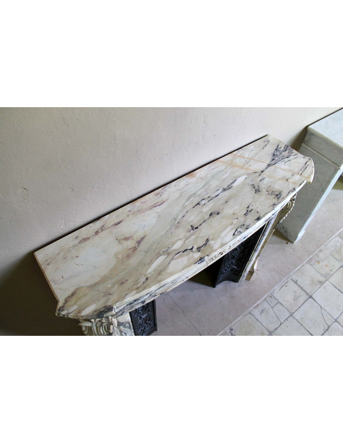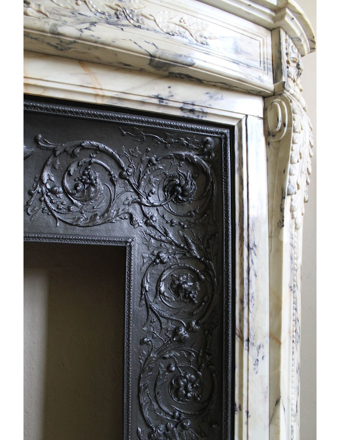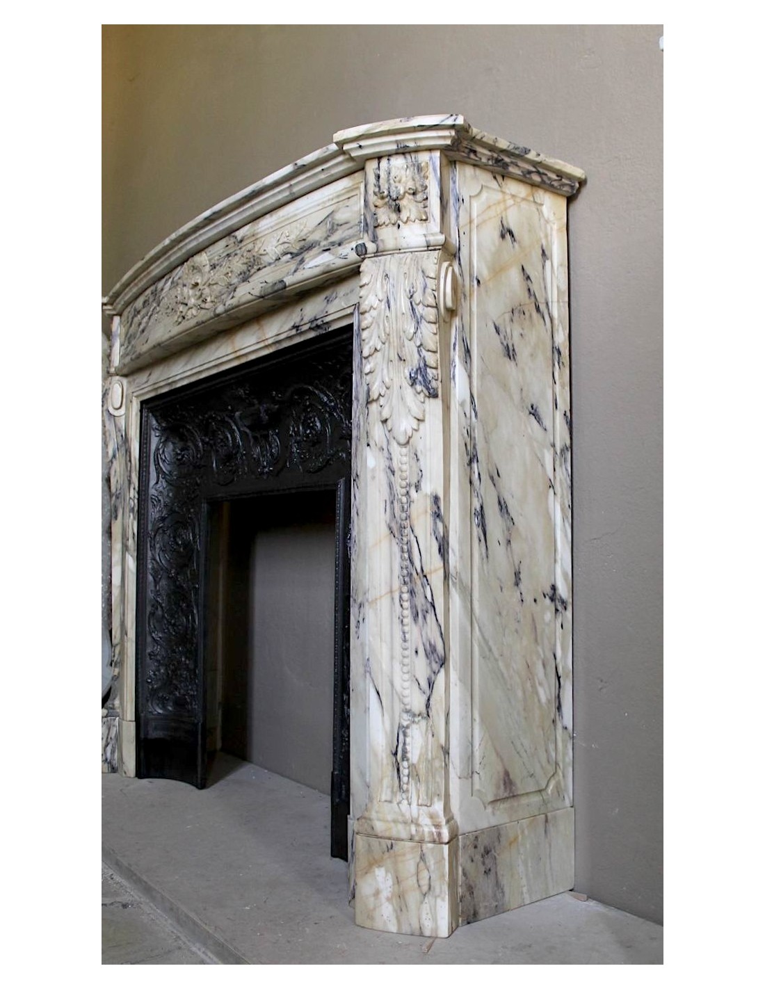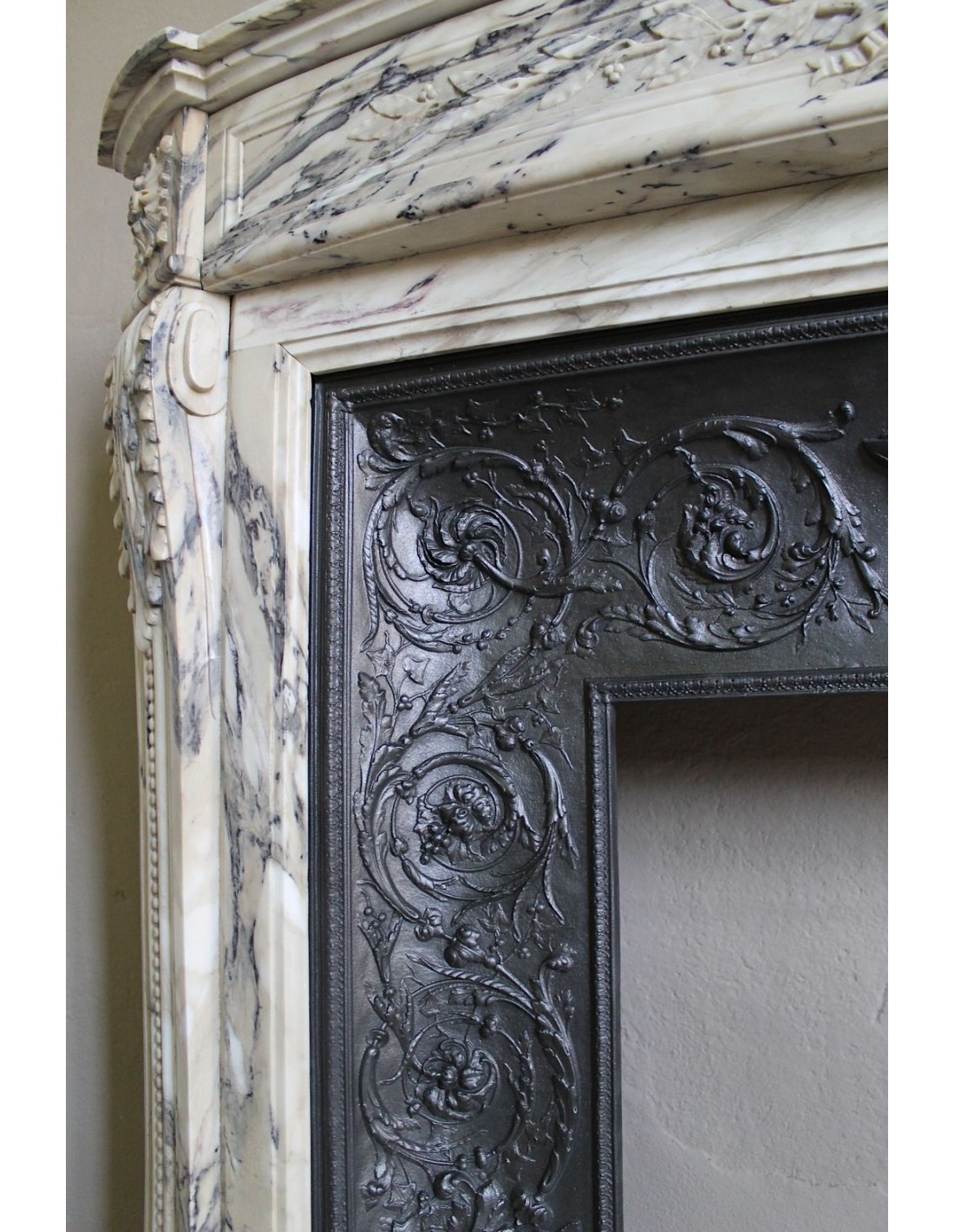Questo camino fa parte della grande famiglia degli stili neoclassici, sostanzialmente la più importante nel periodo Napoleone III (1850-80) ed in particolare questo esemplare, pur con tutti gli adeguamenti di quel periodo, fa indubitabilmente, riferimento allo stile Luigi XVI (ultimo quarto del ‘700). E sino lì, tutto va bene.. Però (e qui casca l’asino) il suo frontale, la cui superficie ospita la scultura più importante di tutto il camino, non è lineare, non è squadrato e fermo come un corazziere, bensì (ORRORE!!) è “curvato” (o, se preferite “arcuato”). Non solo, a ben guardare, anche le gambe, per poter accompagnare la curvatura del frontale che stanno sostenendo, non sono in teutonico angolo retto di 90° (DOPPIO ORRORE!!) ma più larghe (con più gradi in larghezza, insomma) perché debbono adattarsi, collimando, alla stondatura del frontale.. Una sorta di “Voglia di Novità” per gli architetti che l’hanno progettata, una Bestemmia per i puristi neoclassici. A questo punto è stato anche necessario cambiare il nome al camino stesso.. Non si poteva chiamarlo “Louis Seize” e basta perché non esiste (non può esistere) un Luigi XVI con un frontale arcuato e così gli fu dato il nome di “Louis Seize Arrondi” (ARRONDI’ è un aggettivo francese che significa “arrotondato”) (che sarebbe come dire.. Sì, è di quella brava e bella famiglia, ma ha qualche problema, mica è normale..).