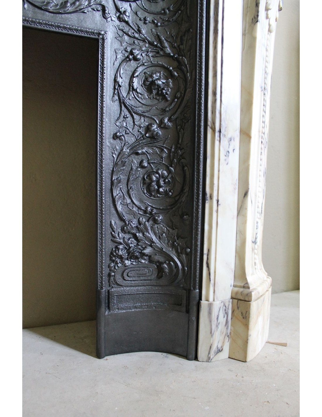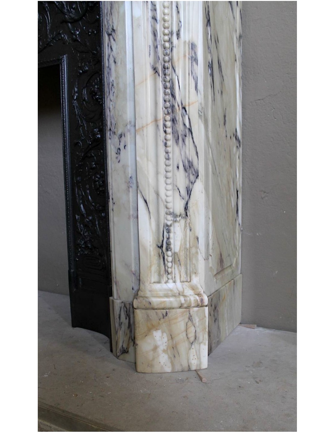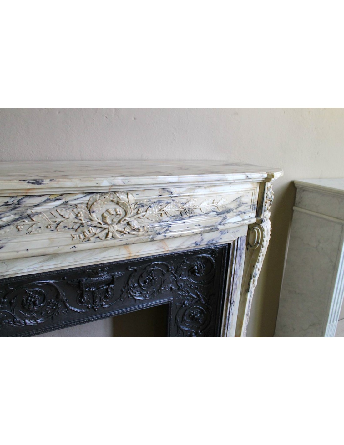 Questo camino fa parte della grande famiglia degli stili neoclassici, sostanzialmente la più importante nel periodo Napoleone III (1850-80) ed in particolare questo esemplare, pur con tutti gli adeguamenti di quel periodo, fa indubitabilmente, riferimento allo stile Luigi XVI (ultimo quarto del ‘700). E sino lì, tutto va bene.. Però (e qui casca l’asino) il suo frontale, la cui superficie ospita la scultura più importante di tutto il camino, non è lineare, non è squadrato e fermo come un corazziere, bensì (ORRORE!!) è “curvato” (o, se preferite “arcuato”). Non solo, a ben guardare, anche le gambe, per poter accompagnare la curvatura del frontale che stanno sostenendo, non sono in teutonico angolo retto di 90° (DOPPIO ORRORE!!) ma più larghe (con più gradi in larghezza, insomma) perché debbono adattarsi, collimando, alla stondatura del frontale.. Una sorta di “Voglia di Novità” per gli architetti che l’hanno progettata, una Bestemmia per i puristi neoclassici. A questo punto è stato anche necessario cambiare il nome al camino stesso.. Non si poteva chiamarlo “Louis Seize” e basta perché non esiste (non può esistere) un Luigi XVI con un frontale arcuato e così gli fu dato il nome di “Louis Seize Arrondi” (ARRONDI’ è un aggettivo francese che significa “arrotondato”) (che sarebbe come dire.. Sì, è di quella brava e bella famiglia, ma ha qualche problema, mica è normale..).