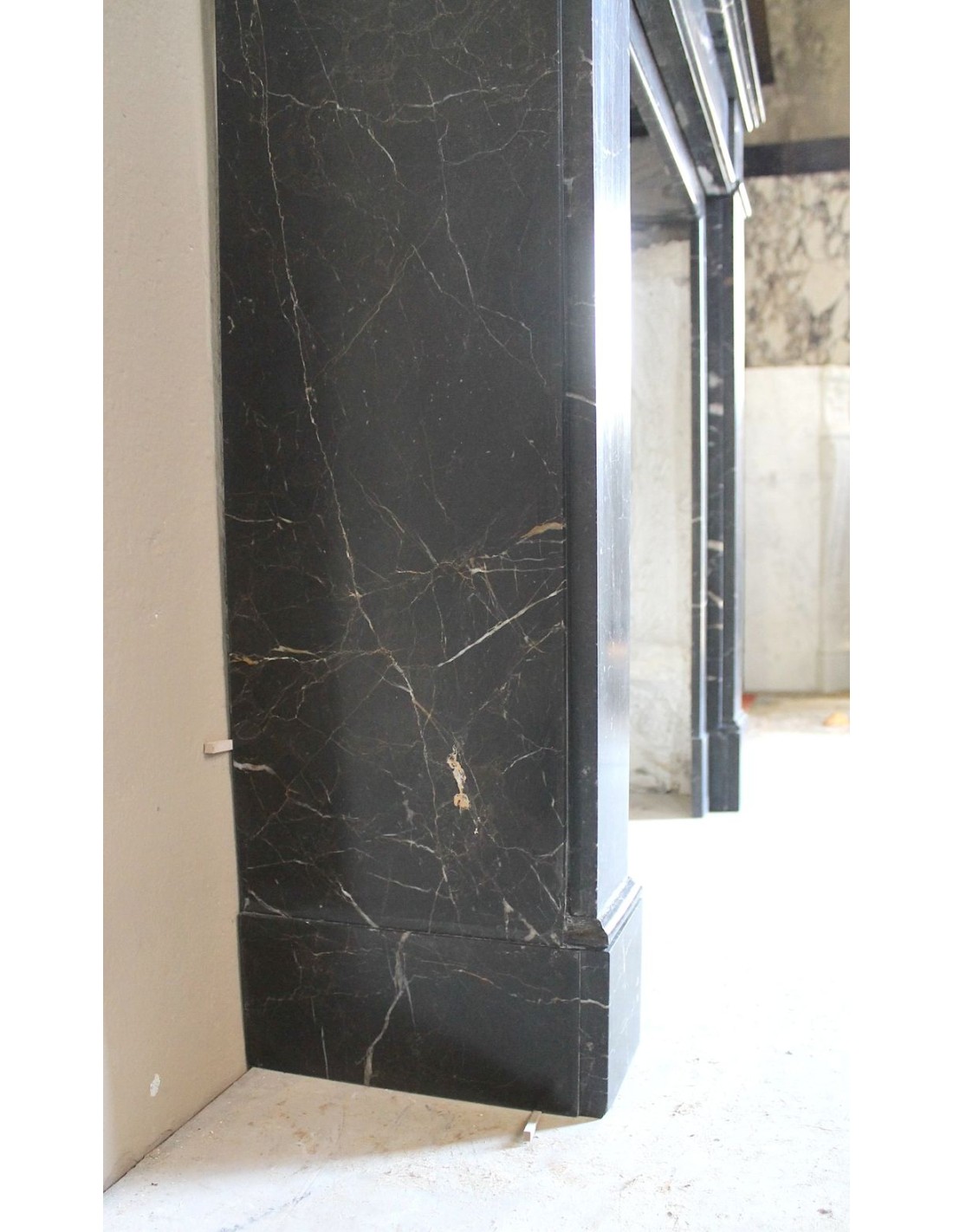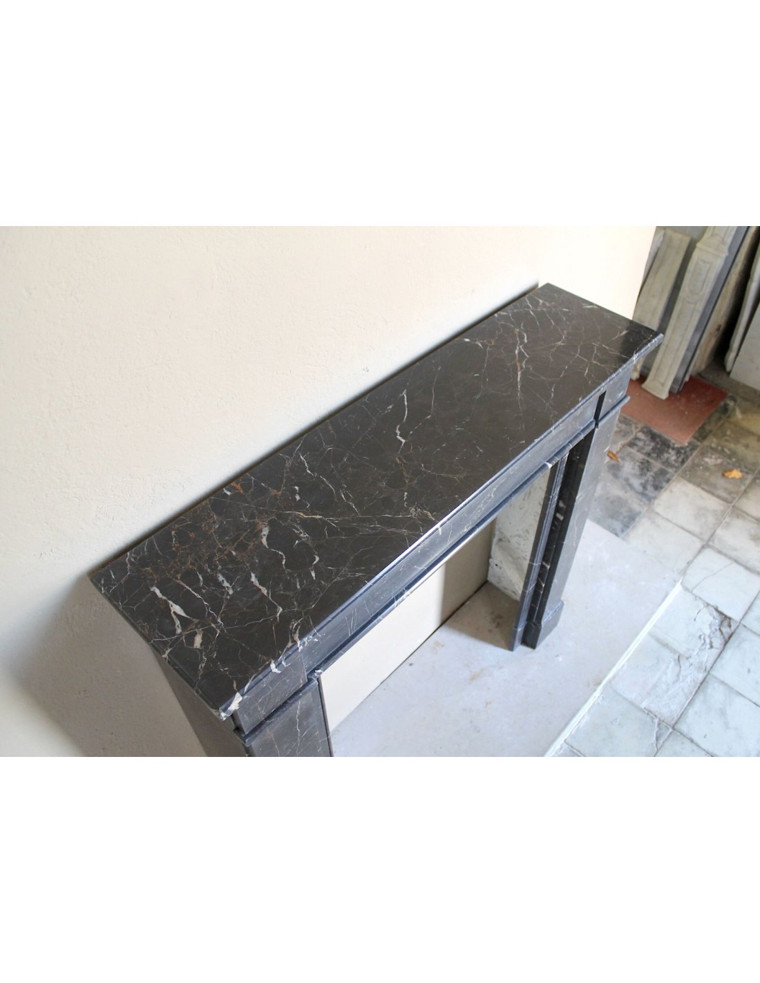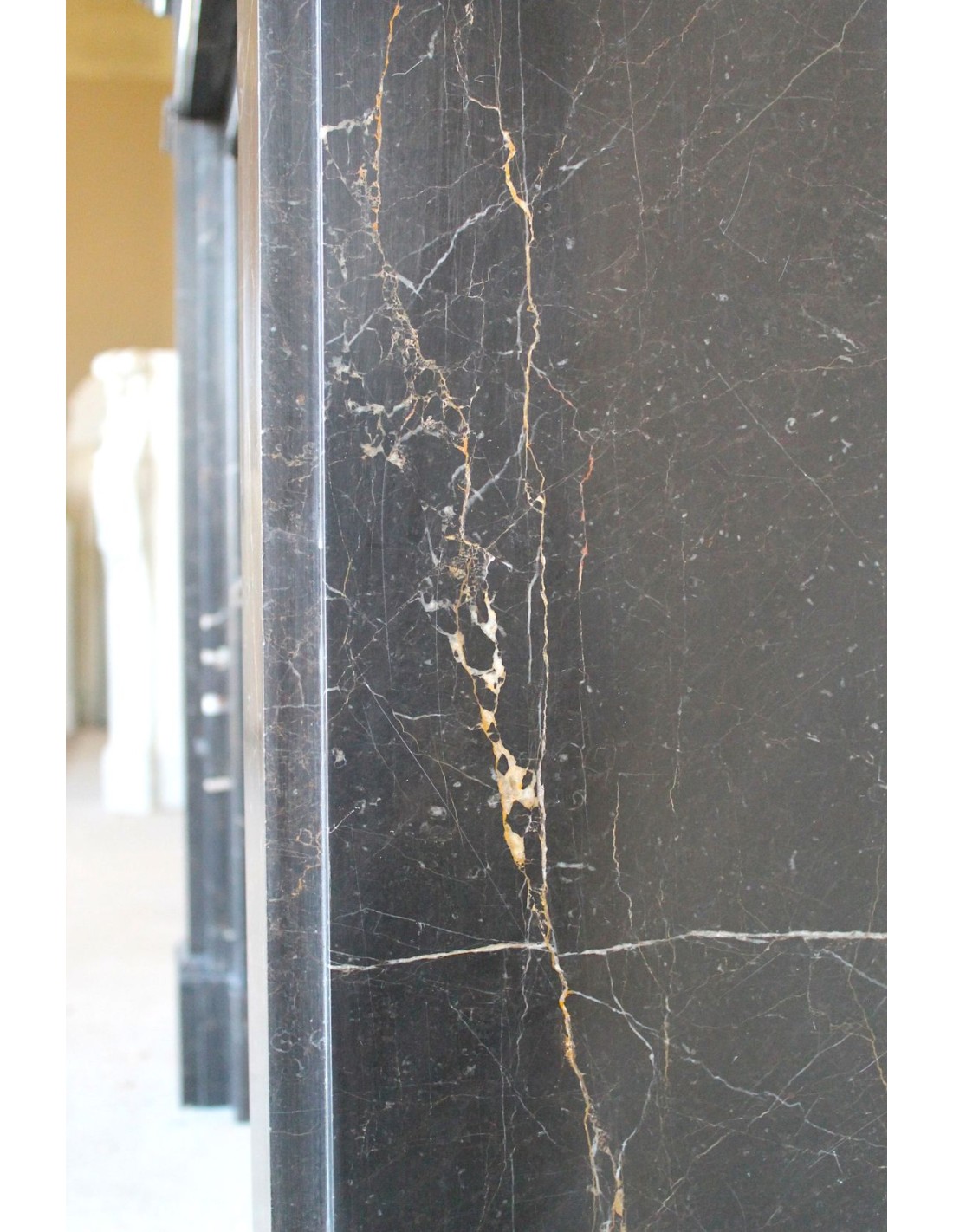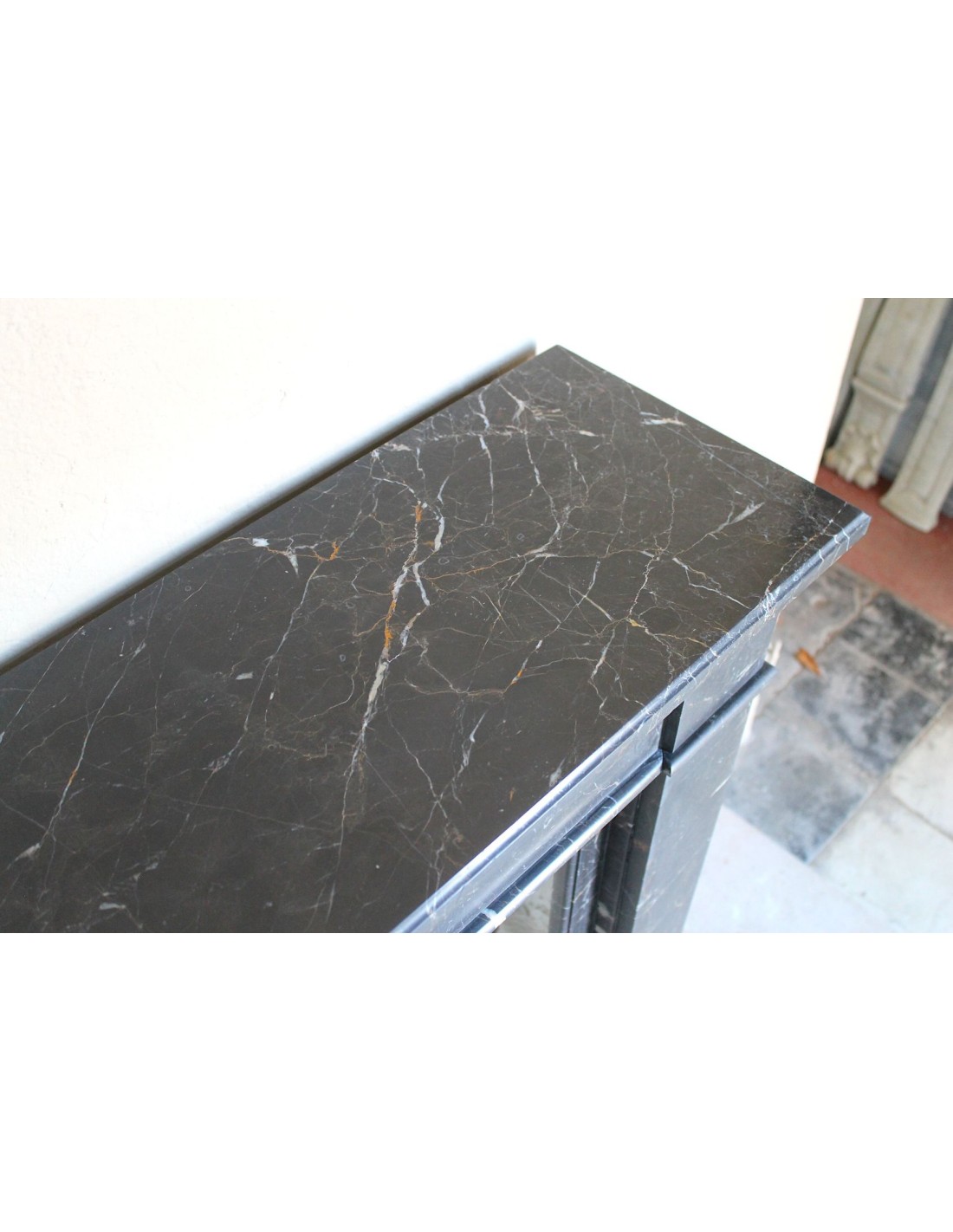 Anche il suo raffinatissimo (sottolineo questo suffisso superlativo assoluto) marmo ha la sua parte nel fascino di questo camino e, tra l’altro, è quasi sconosciuto in Italia. Si chiama “Noir Saint Laurent”, ha un fondo nerissimo sul quale appaiono rare frezzature bianche e rosse, ELEGANTISSIME.