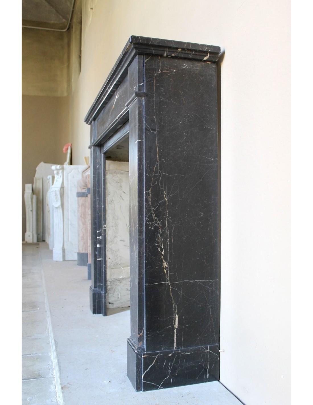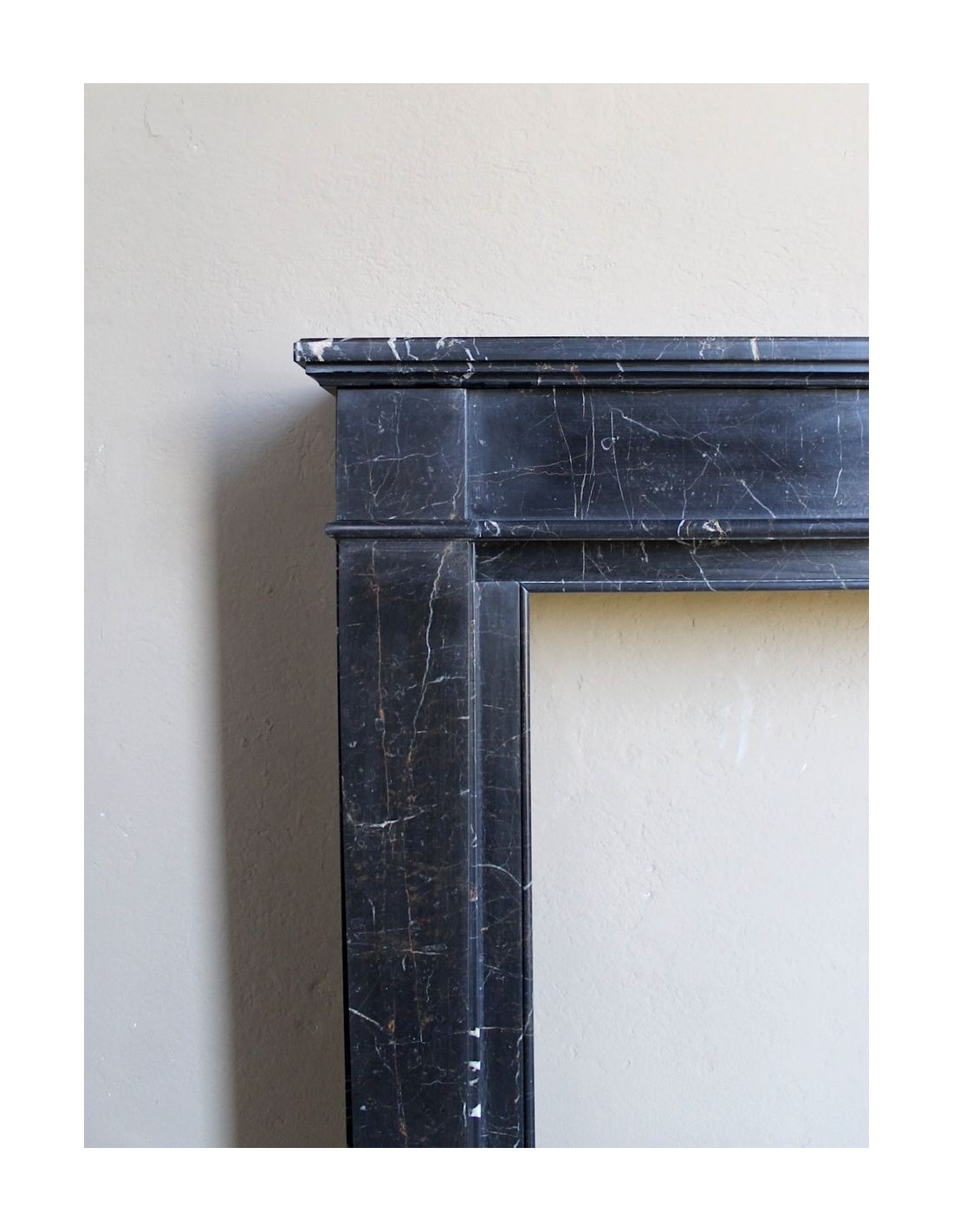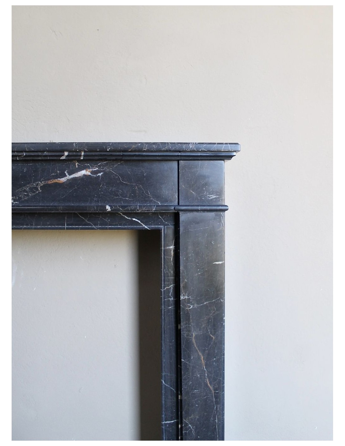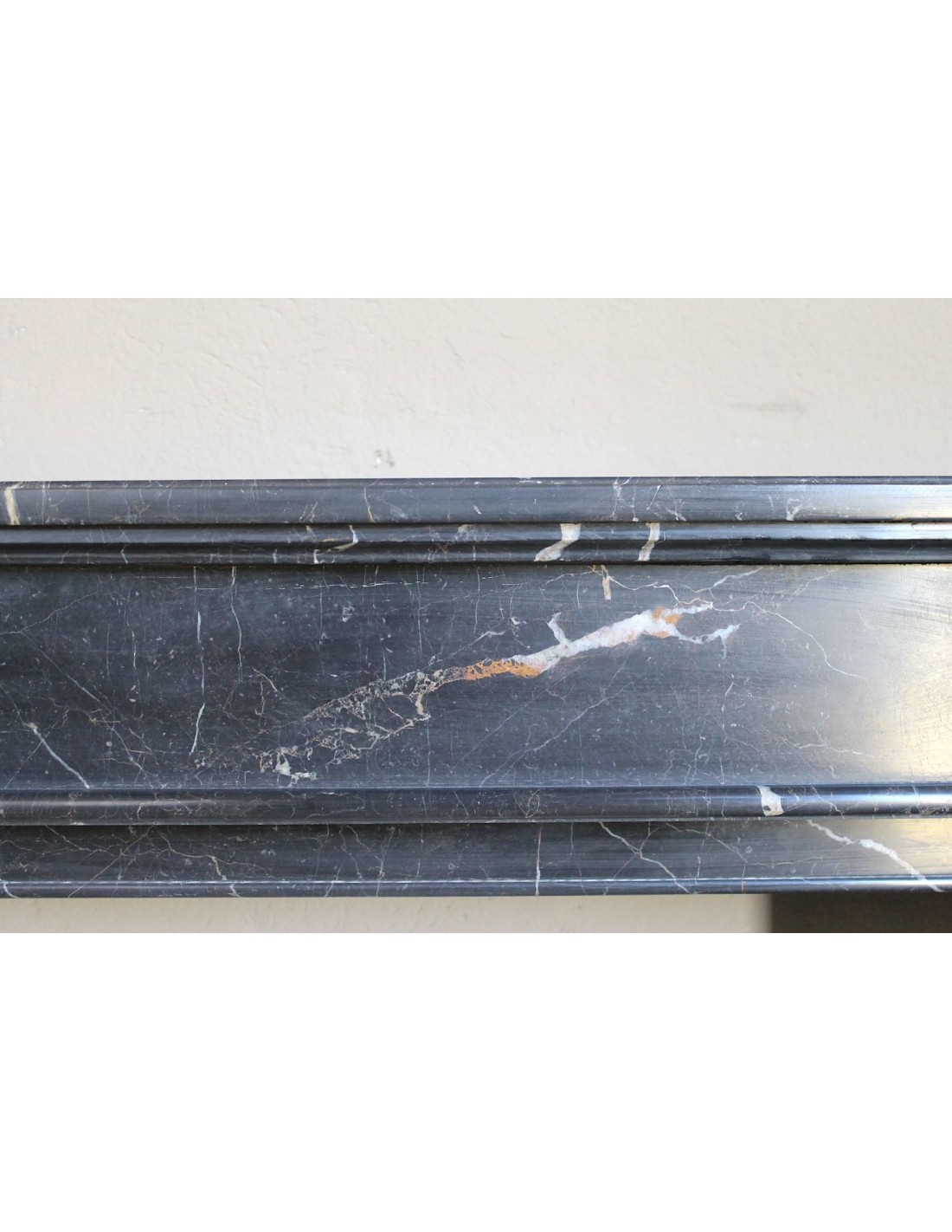 Anche il suo raffinatissimo (sottolineo questo suffisso superlativo assoluto) marmo ha la sua parte nel fascino di questo camino e, tra l’altro, è quasi sconosciuto in Italia. Si chiama “Noir Saint Laurent”, ha un fondo nerissimo sul quale appaiono rare frezzature bianche e rosse, ELEGANTISSIME.