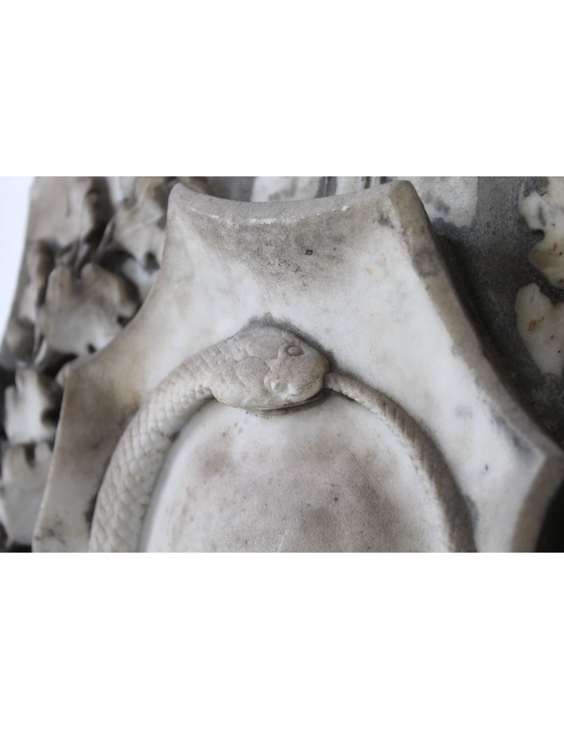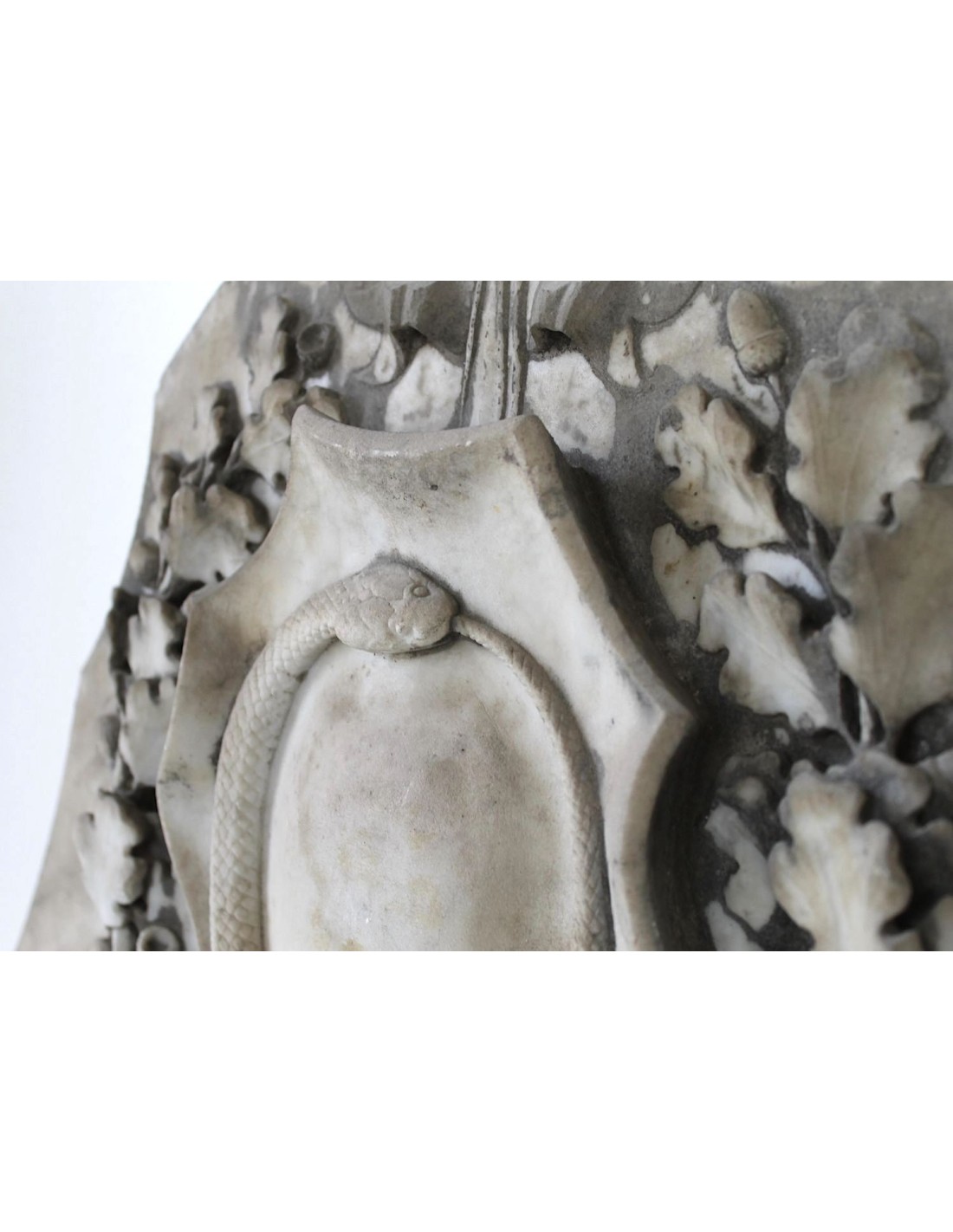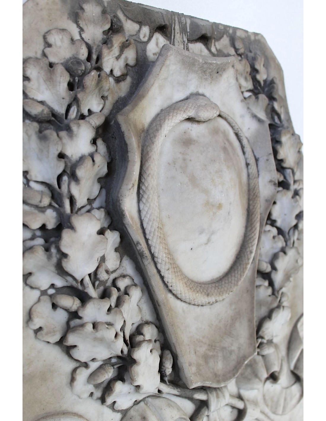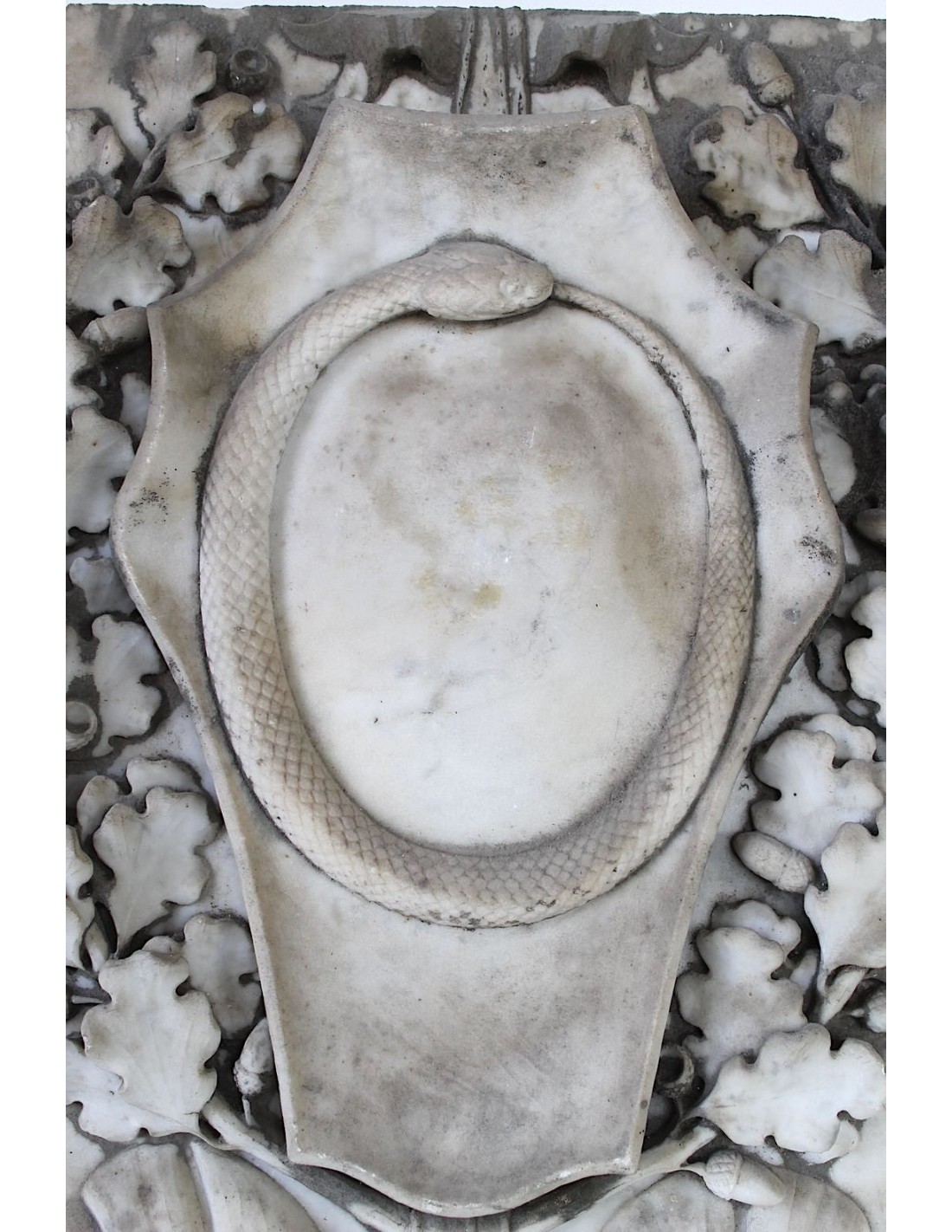 Lo stemma presenta, oltre ai florilegi ed ai nastri di contorno, una, finissima di fattura, vipera che si morde la coda, scuramente l'emblema di una nobile famiglia lucchese (se c'è qualcuno di Lucca che sa, parli, ne sarò felice..). Dimenticavo, la conservazione di queste sculture è PERFETTA.