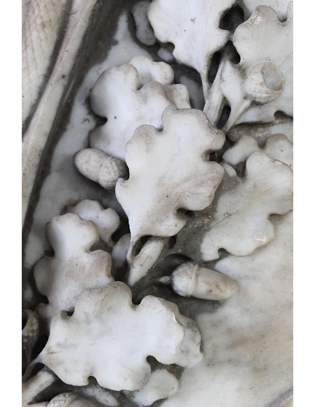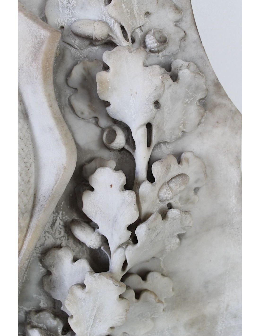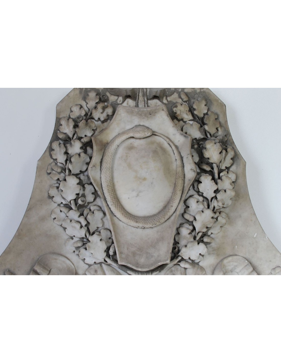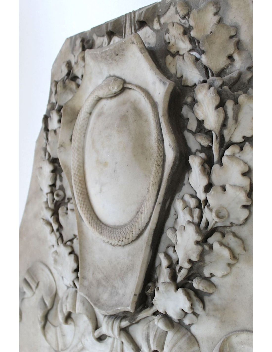 Lo stemma presenta, oltre ai florilegi ed ai nastri di contorno, una, finissima di fattura, vipera che si morde la coda, scuramente l'emblema di una nobile famiglia lucchese (se c'è qualcuno di Lucca che sa, parli, ne sarò felice..). Dimenticavo, la conservazione di queste sculture è PERFETTA.