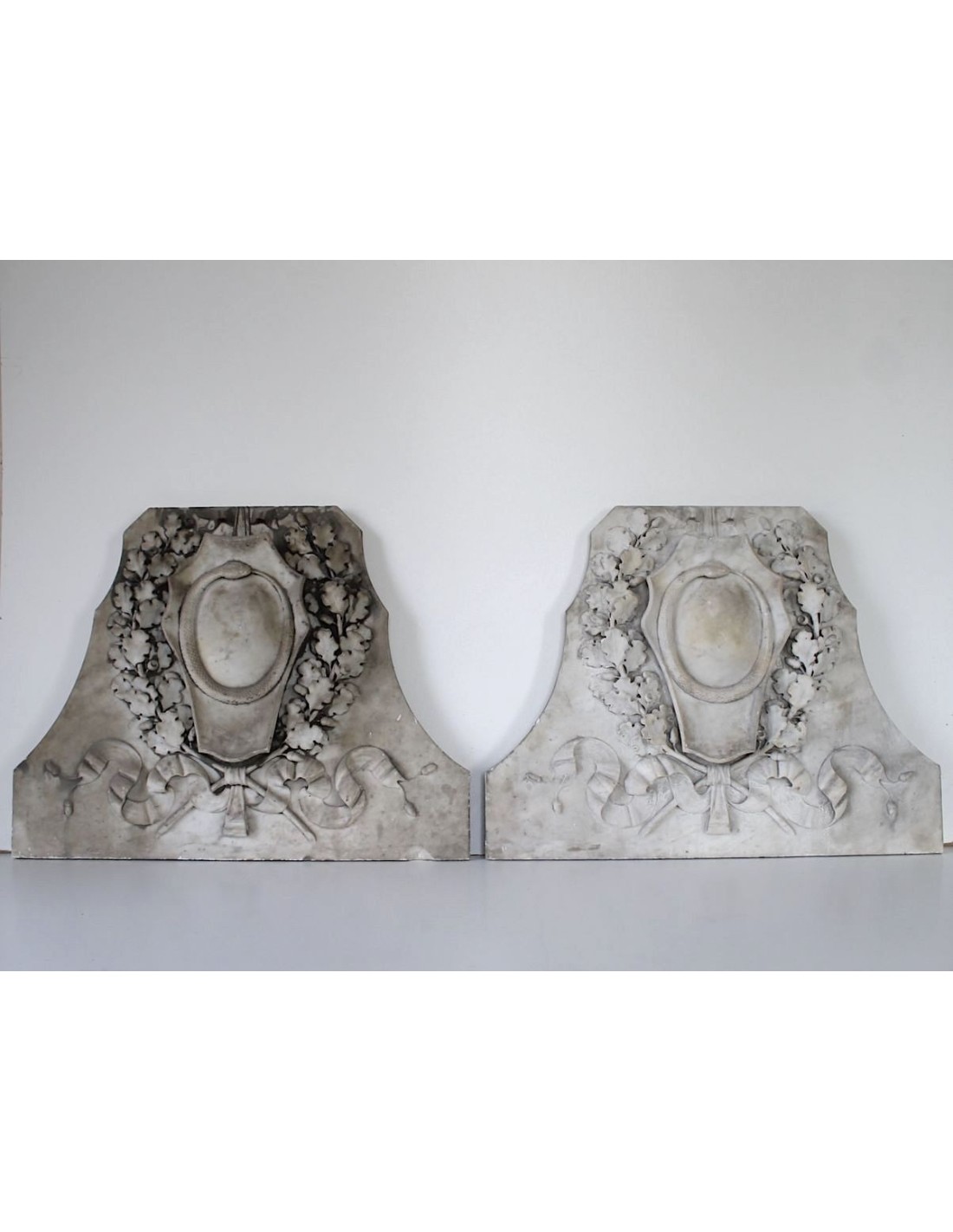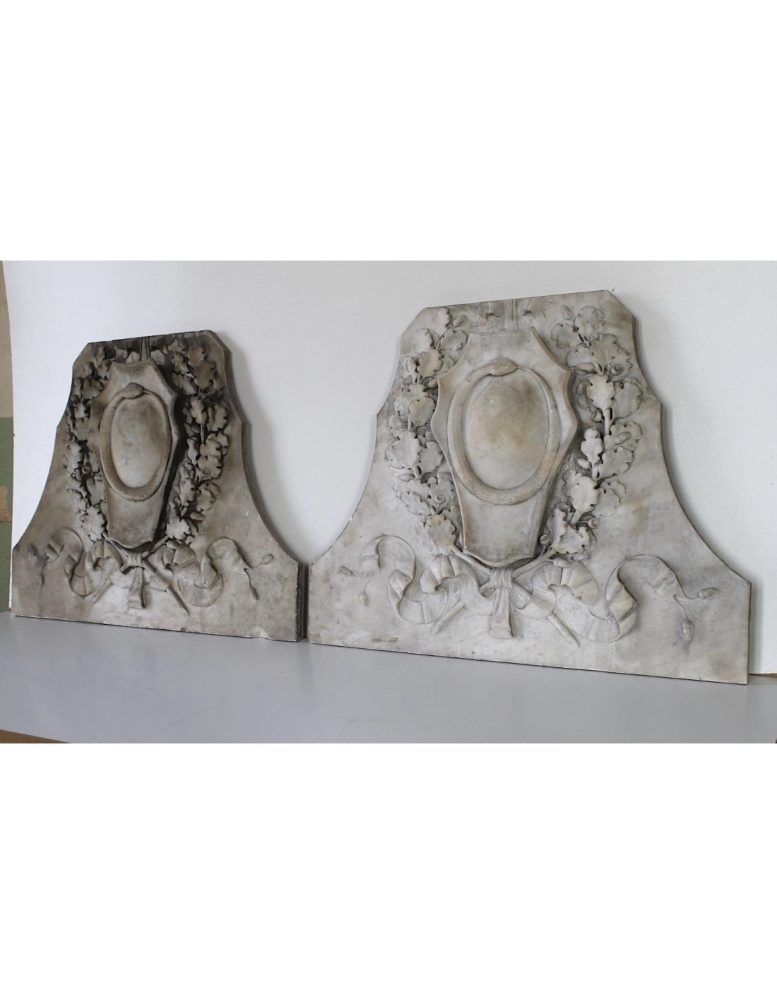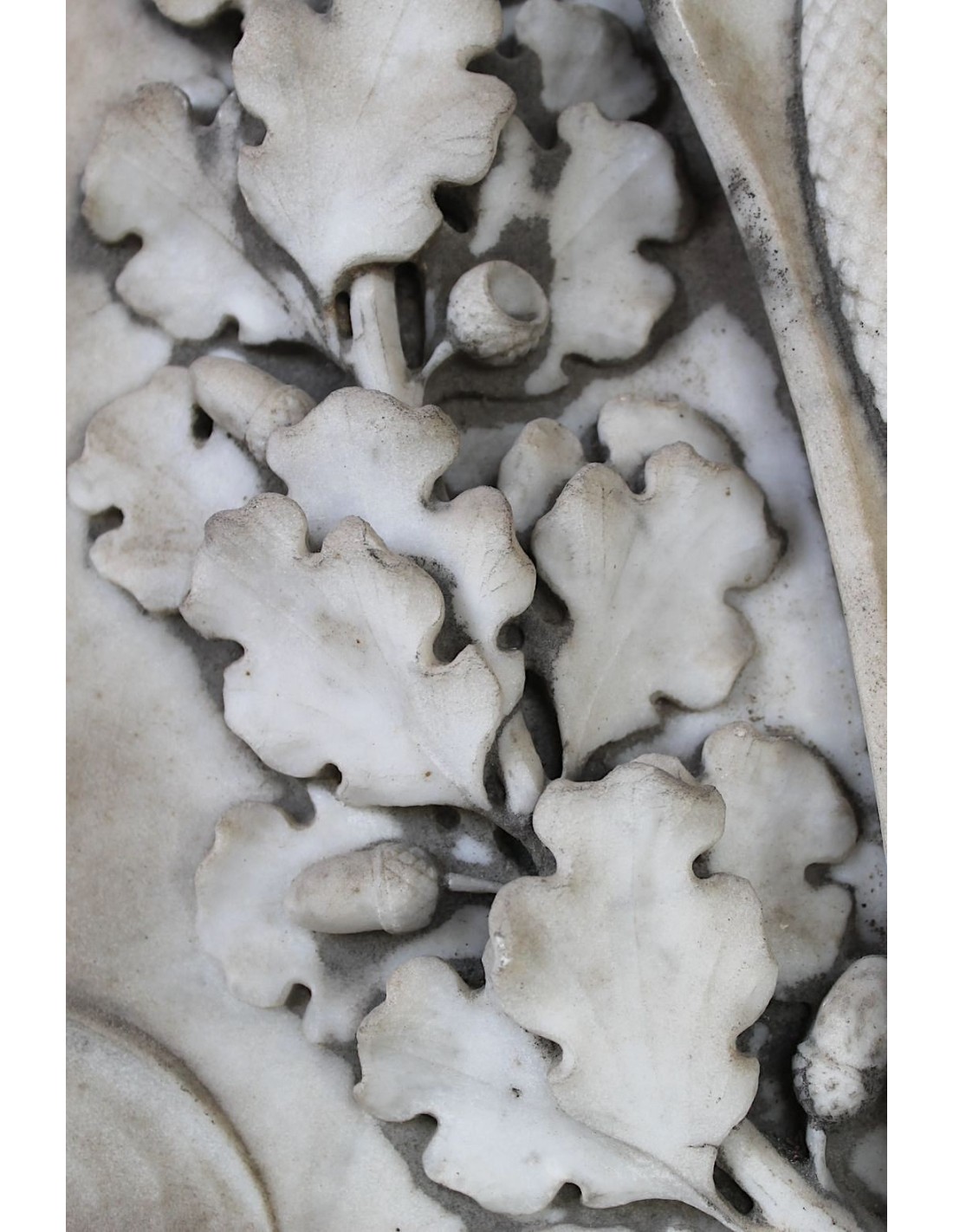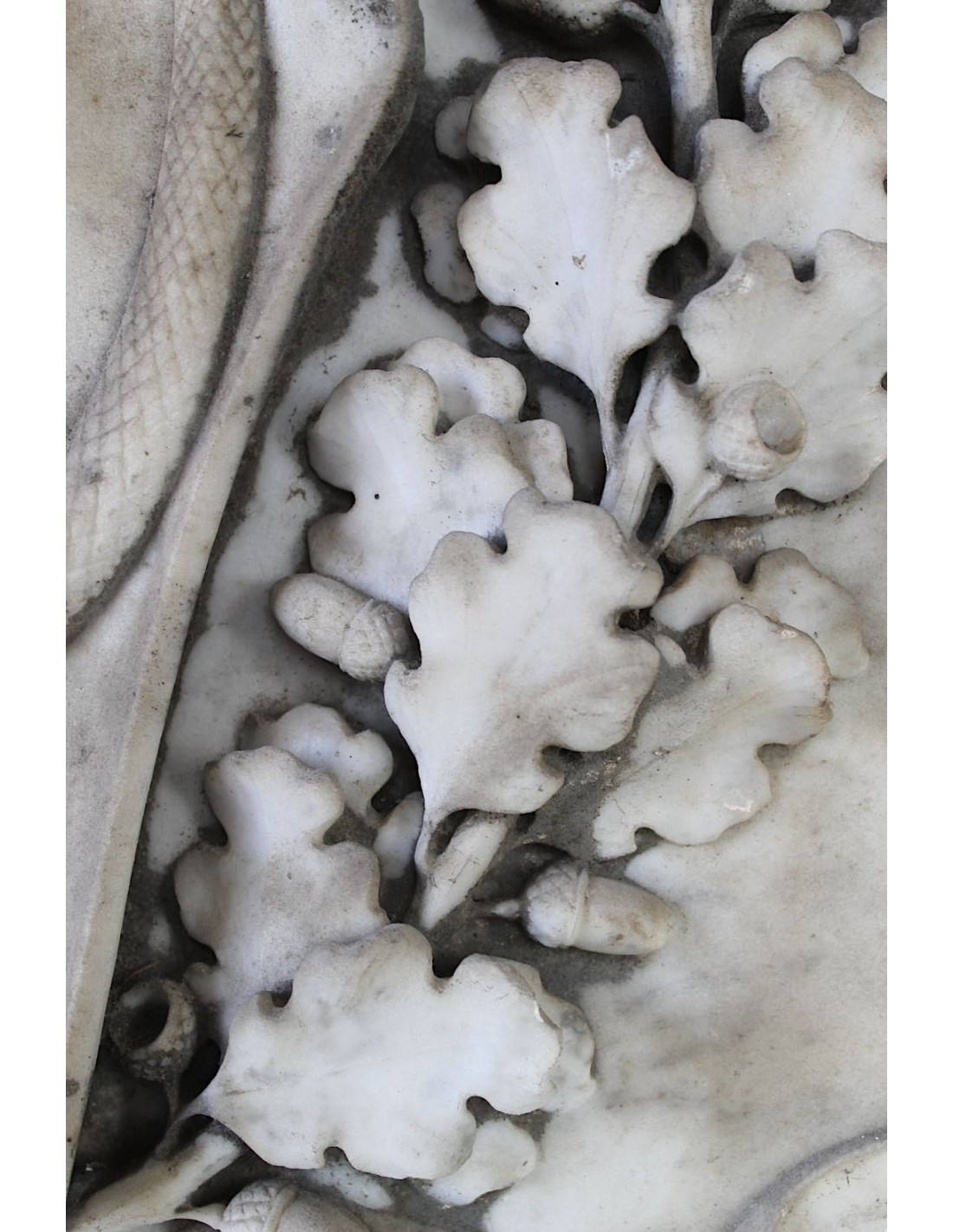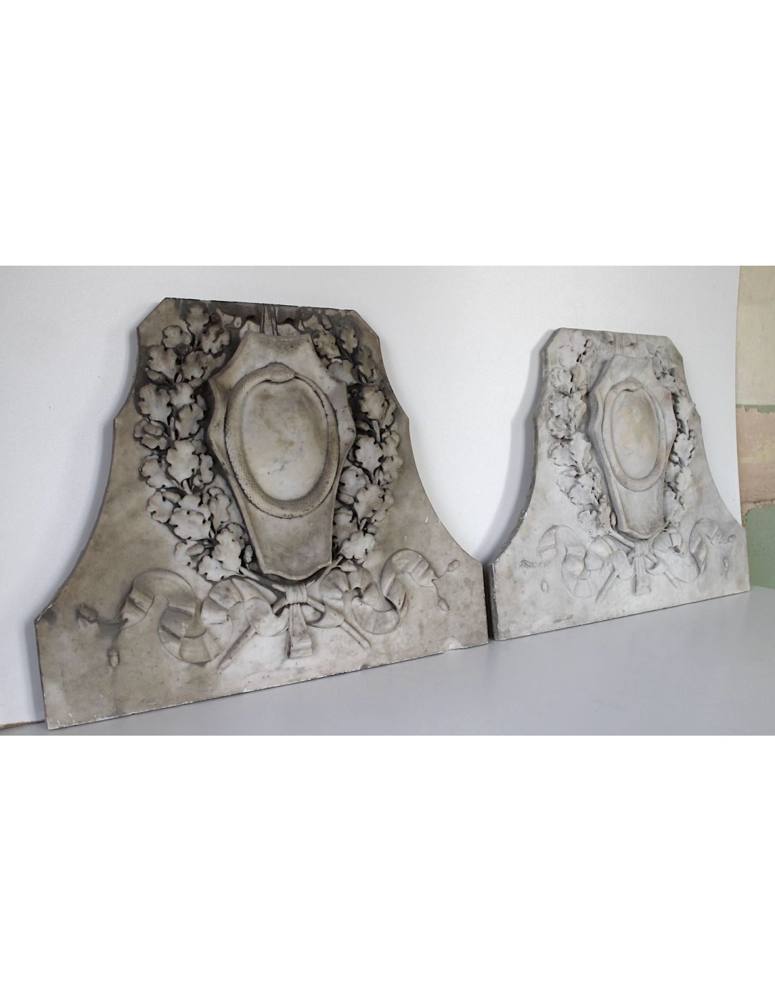 Lo stemma presenta, oltre ai florilegi ed ai nastri di contorno, una, finissima di fattura, vipera che si morde la coda, scuramente l'emblema di una nobile famiglia lucchese (se c'è qualcuno di Lucca che sa, parli, ne sarò felice..). Dimenticavo, la conservazione di queste sculture è PERFETTA.